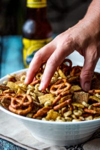 Tip: You just have to make sure that you make it at least a couple hours before you are wanting to serve it. Even the day before. It needs to be mixed well a number of times to coat all the goodies in the seasoning really well and the oil needs time to sink in and dry. You don’t want an oily mix. But don’t kid yourself, you will be stealing from the bowl before its good and ready. Mark my words!