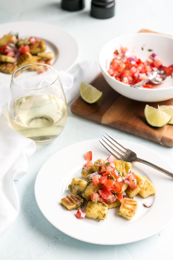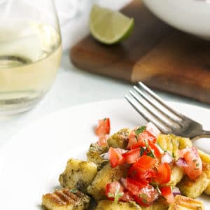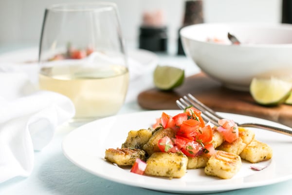 Homemade gluten free gnocchi is easy and fun to make and tastes way better than store bought gnochi. This gnocchi recipe is pillowy soft and fluffy on the inside, pan fried to a golden crispy brown on the outside, tossed in truffled pesto and topped with fresh pico de gallo. Fabulous for lunch with the girls or an appetizer before dinner.